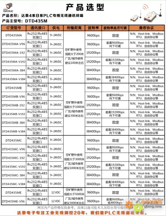 DTD435M是針對日系PLC的通訊特點而開發的專用工業級無線通訊產品,達泰4系無線數據通訊終端內嵌RS232/RS485雙接口,自適應三菱N:N:協議、歐姆龍HOST Link協議,臺達及永宏等Modbus RTU協議。