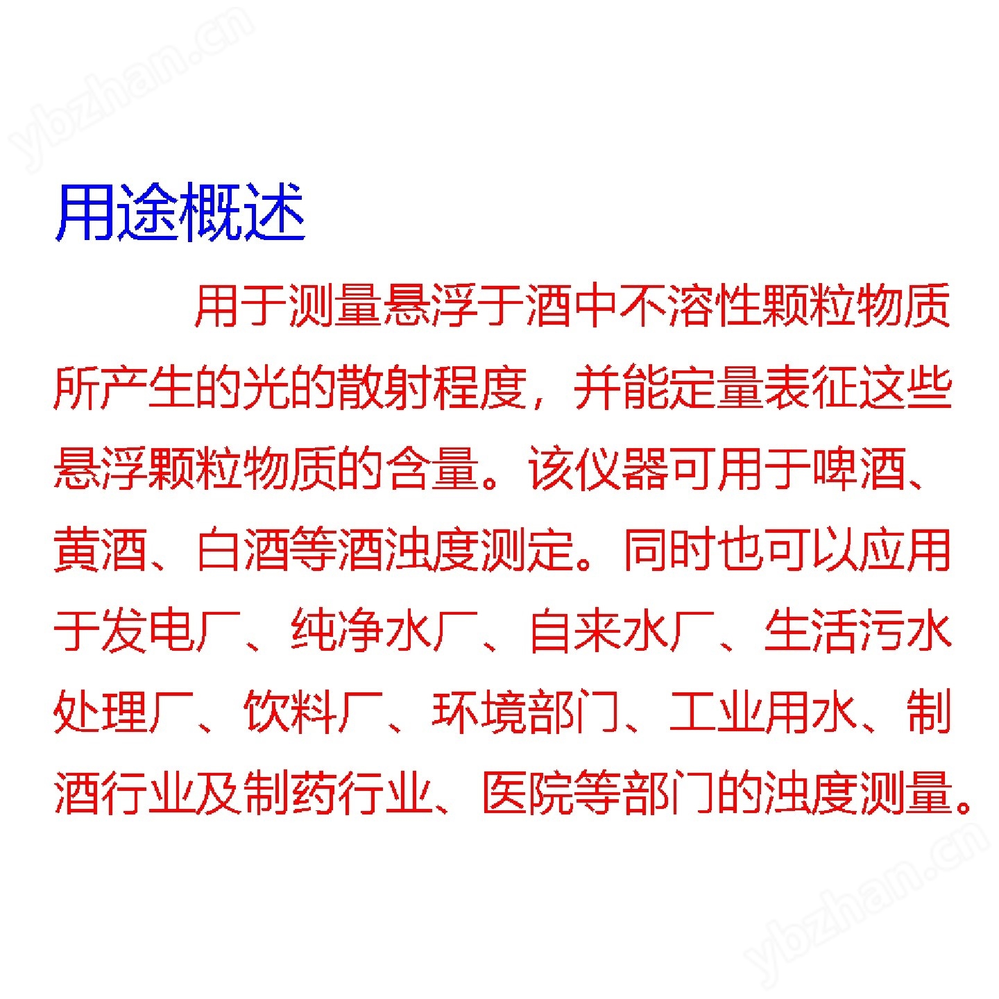 用于測量懸浮于酒中不溶性顆粒物質所產生的光的散射程度,并能定量表征這些懸浮顆粒物質的含量。該儀器可用于啤酒、黃酒、白酒等酒濁度測定。同時也可以應用于發電廠、純凈水廠、自來水廠、生活污水處理廠、飲料廠、環境部門、工業用水、制酒行業及制藥行業、等部門的濁度測量。