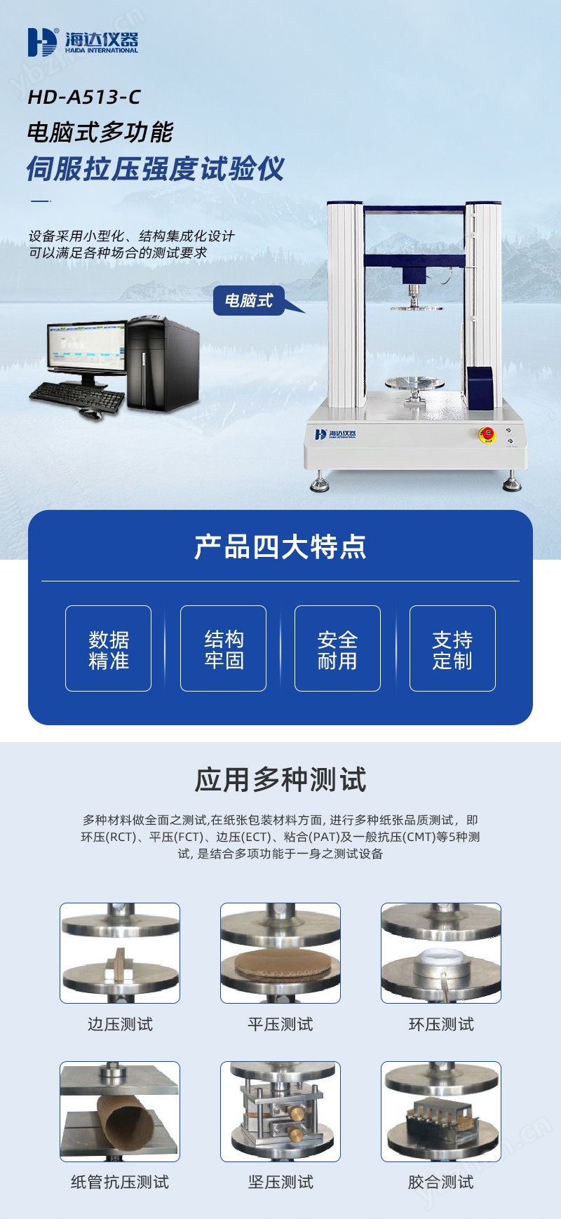 海達儀器HD-A513-C 電腦式多功能伺服拉壓強度試驗儀專業適用于復合材料、包裝材料、背板材料、塑料管、無紡布、混凝土、膠粘劑、橡膠等非金屬材料和醫療器械、線纜、鋼材等金屬產品的拉伸、抗彎、壓縮、膠合強度、撕裂、穿刺力、開啟力、解卷力、拔開力等性能測試,可配合多種紙張包裝材料來進行多種紙張質量測試,如環壓(RCT)、平壓(FCT、CMT)、邊壓(ECT)、粘合(PAT)、豎壓(CCT)、多種測試,是結合多項功能于一體的測試設備。